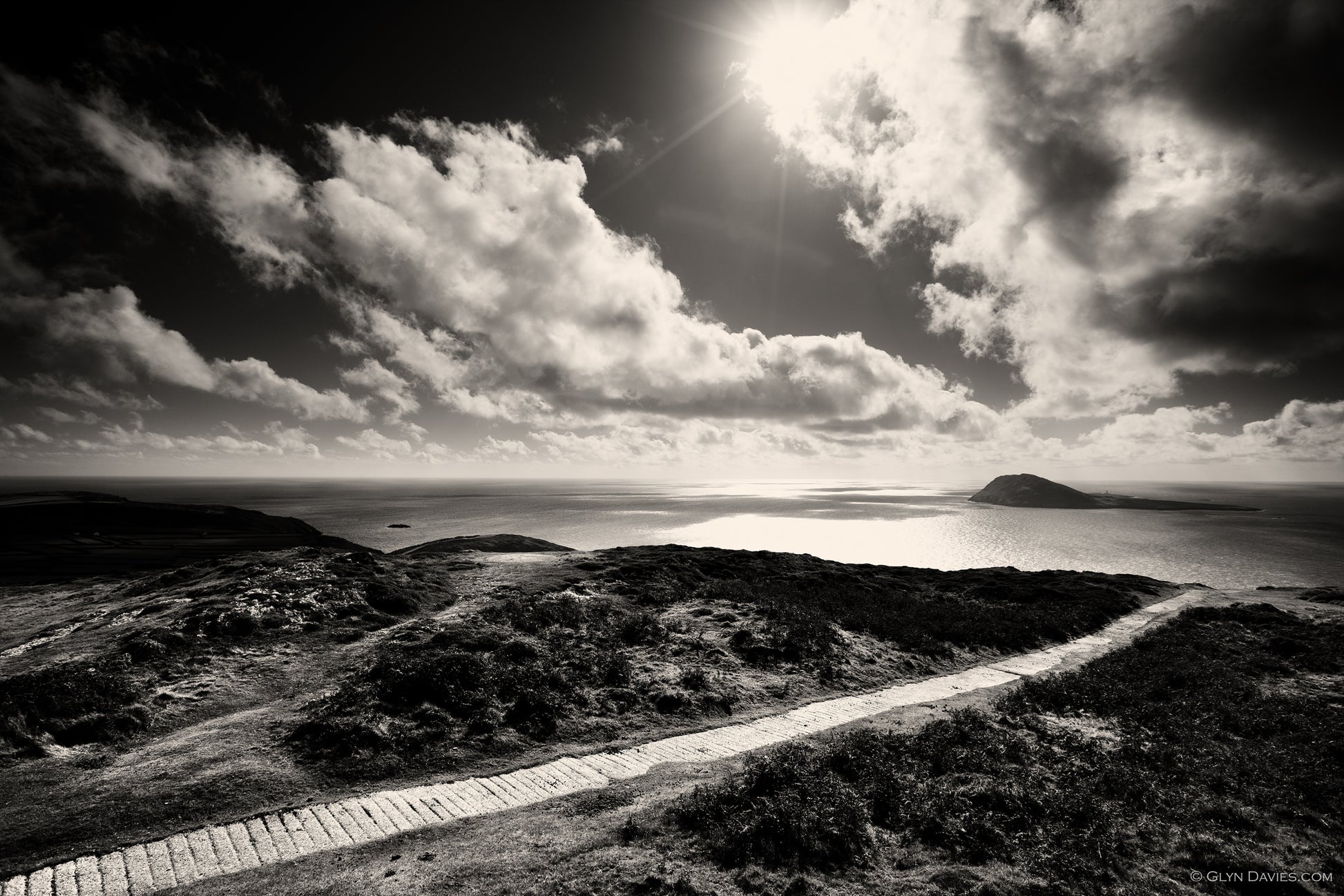 There were a freshness and freedom on this October afternoon, and as I stood on the summit of Mynydd Mawr in a blustery wind the brilliance of the sun was uplifting and inspirational. Light bounced off the sea, off the clouds and off the long narrow path that led down to the very edge of the cliffs.