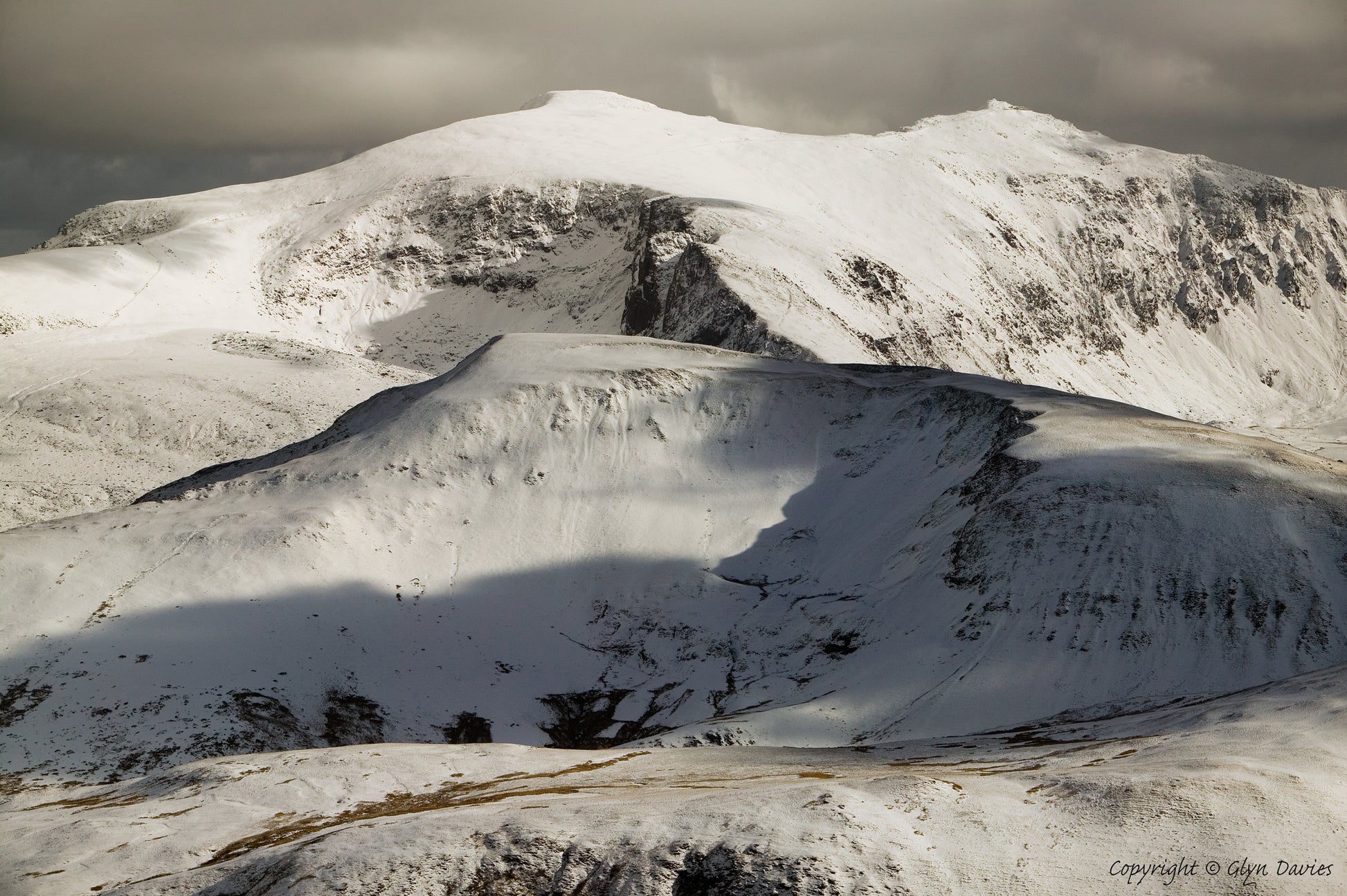"A momentary glimpse of the summit of Snowdon in cloudy, wintry weather. My brother Simon and I were on Moel Eilio enjoying the fresh snow and looking across to Yr Wyddfa (to give Snowdon its proper name) but the last few hundred feet were in persistent cloud. We had given up standing around in the bitter cold in the hope of seeing the peak and had started to make our way back down Moel Eilio when, suddenly, the summit just cleared and brilliant, low, winter sunshine bathed the white hillsides in crisp, clean light. Perhaps just ten minutes later the summit was once again shrouded in dark winter cloud. When you study large prints I make from this image you can clearly see walkers standing on the summit cairn"