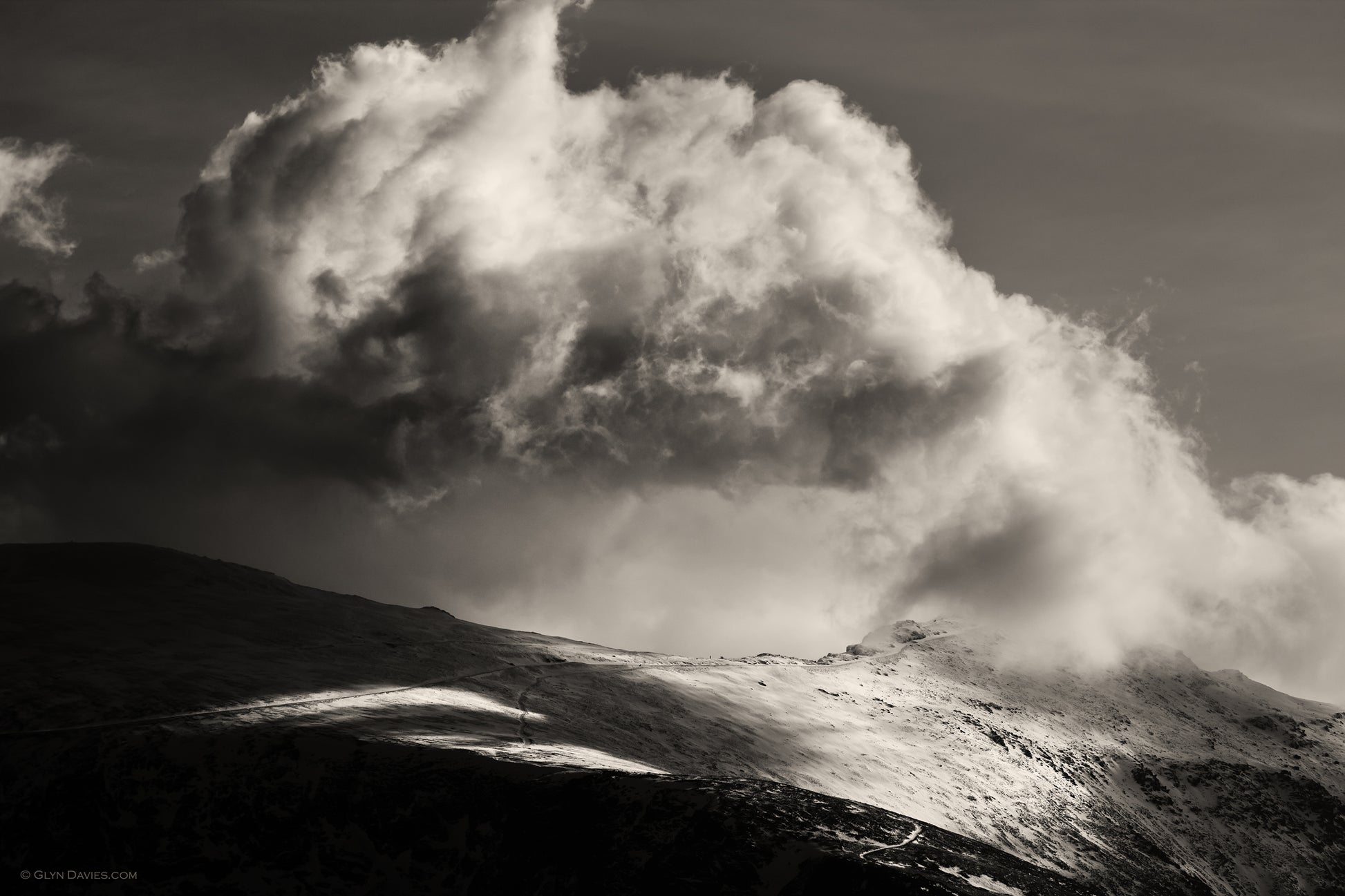 On a bitter day in Snowdonia, numbers of tiny figures appeared on the summit ridge of Snowdon, highest peak in England & Wales, on their cold walk to the café on the top. Equally, the broken snow defines the numerous well worn tracks to this high coffee house, including the famous Snowdon Railway. ..The massive plume of cloud was a humorous visual metaphor for the steam trains which usually stop in England & Wales' highest station :-)