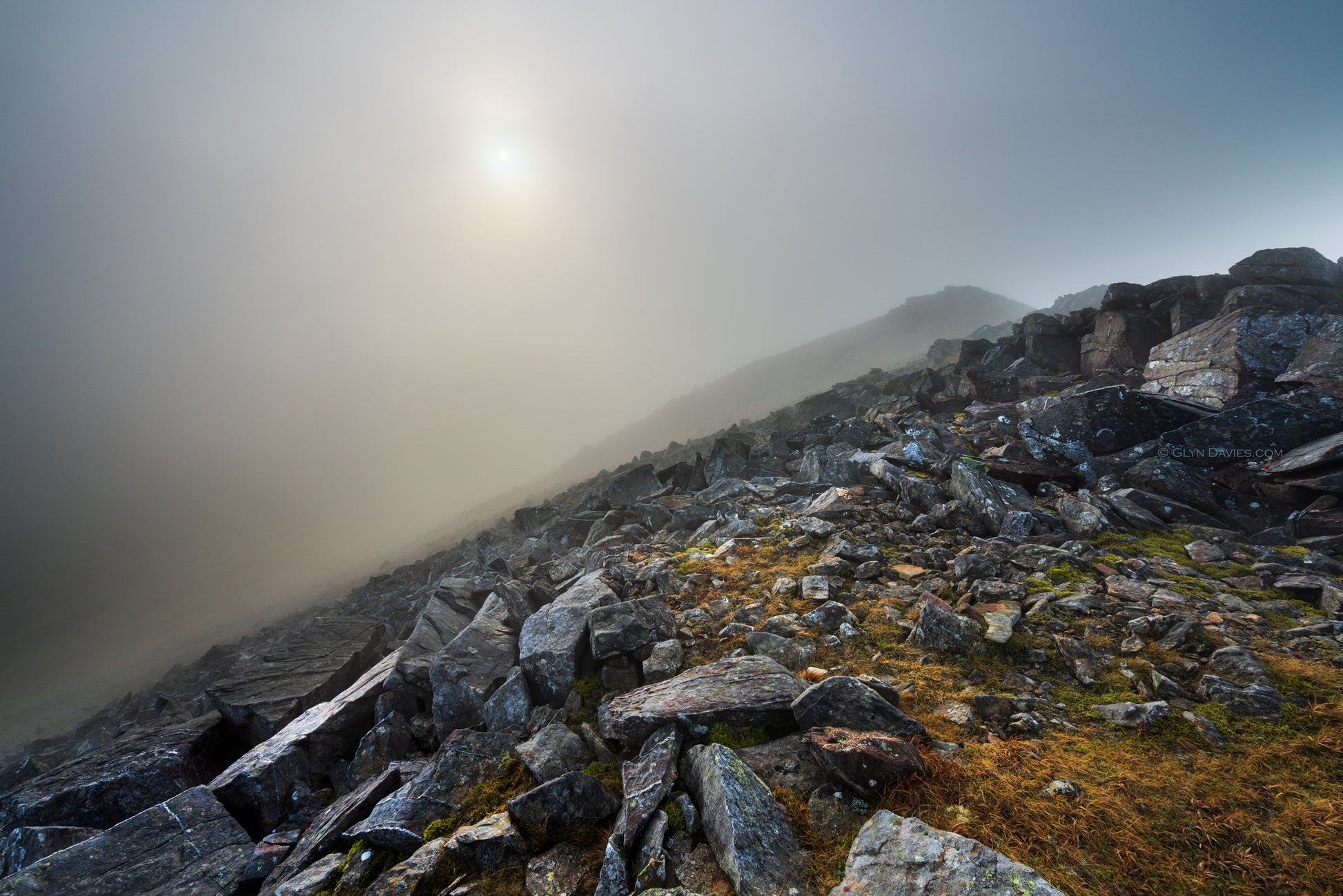 On the summit in dark swirling cloud. A delicate sun glimmered through the vapour, illuminating shards of quartz-covered, shattered wet rock.