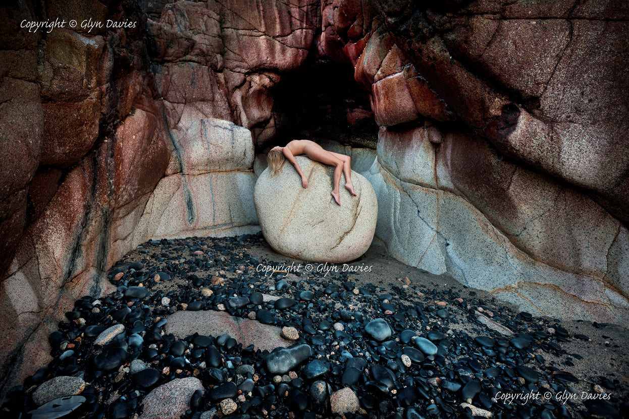 "Life and death are intrinsically linked. The woman lies at the entrance to a womb and a tomb. The gigantic boulder moves in this tiny cove, sometimes blocking the tomb entrance and other times completely exposing Mother Earth. Her delicate figure may just have been born of the bleeding land, or maybe is ready for the next journey, awaiting the hand that will lift her lifeless form and free her spirit"