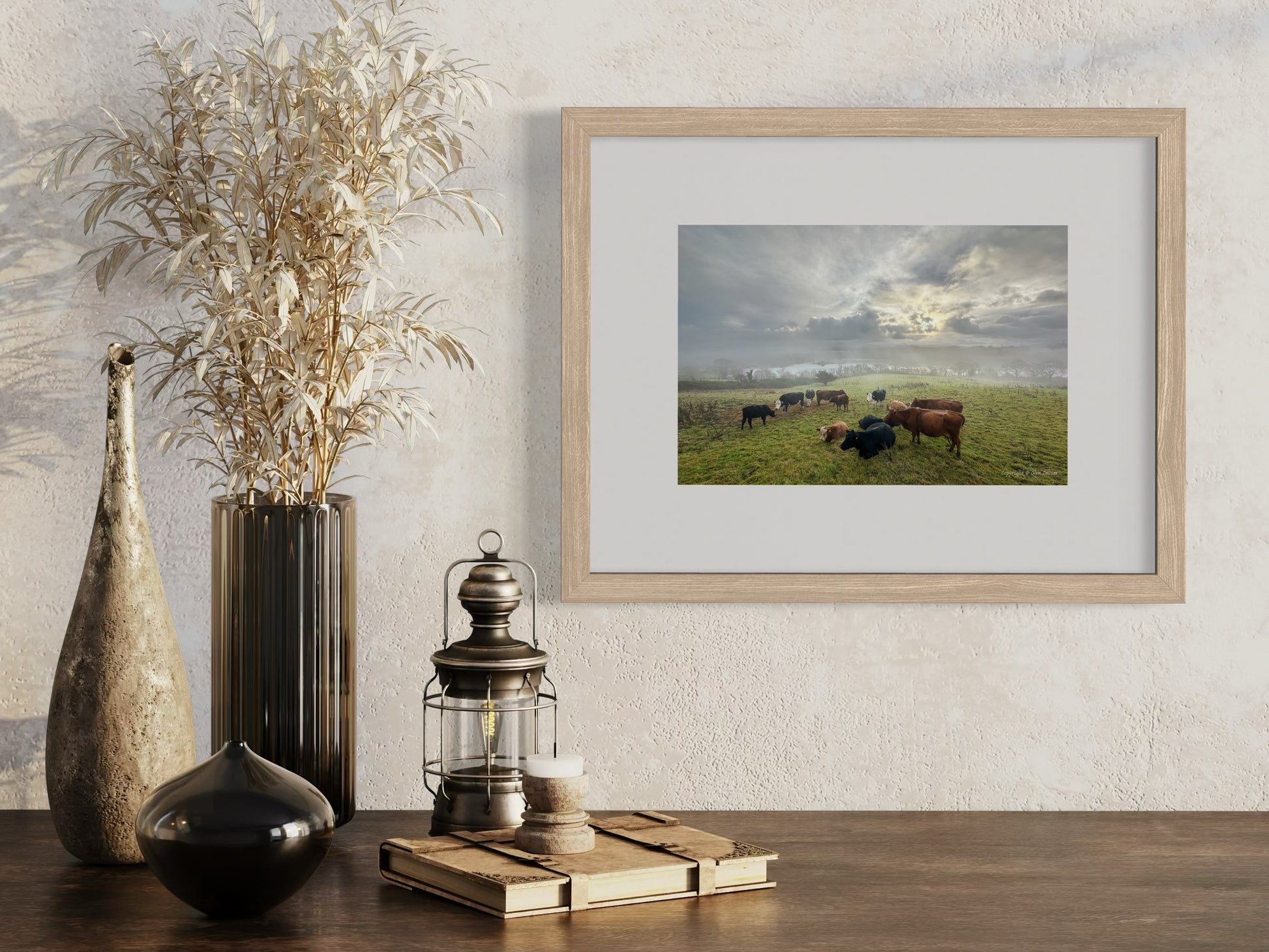 An ethereal morning light diffused by varying layers of mist and thick fog clinging to the Menai Strait, which merged with the clouds above. It was bitterly cold and even the cattle seemed semi frozen by the icy mist. You can just about discern the Menai Suspension Bridge in the distance.