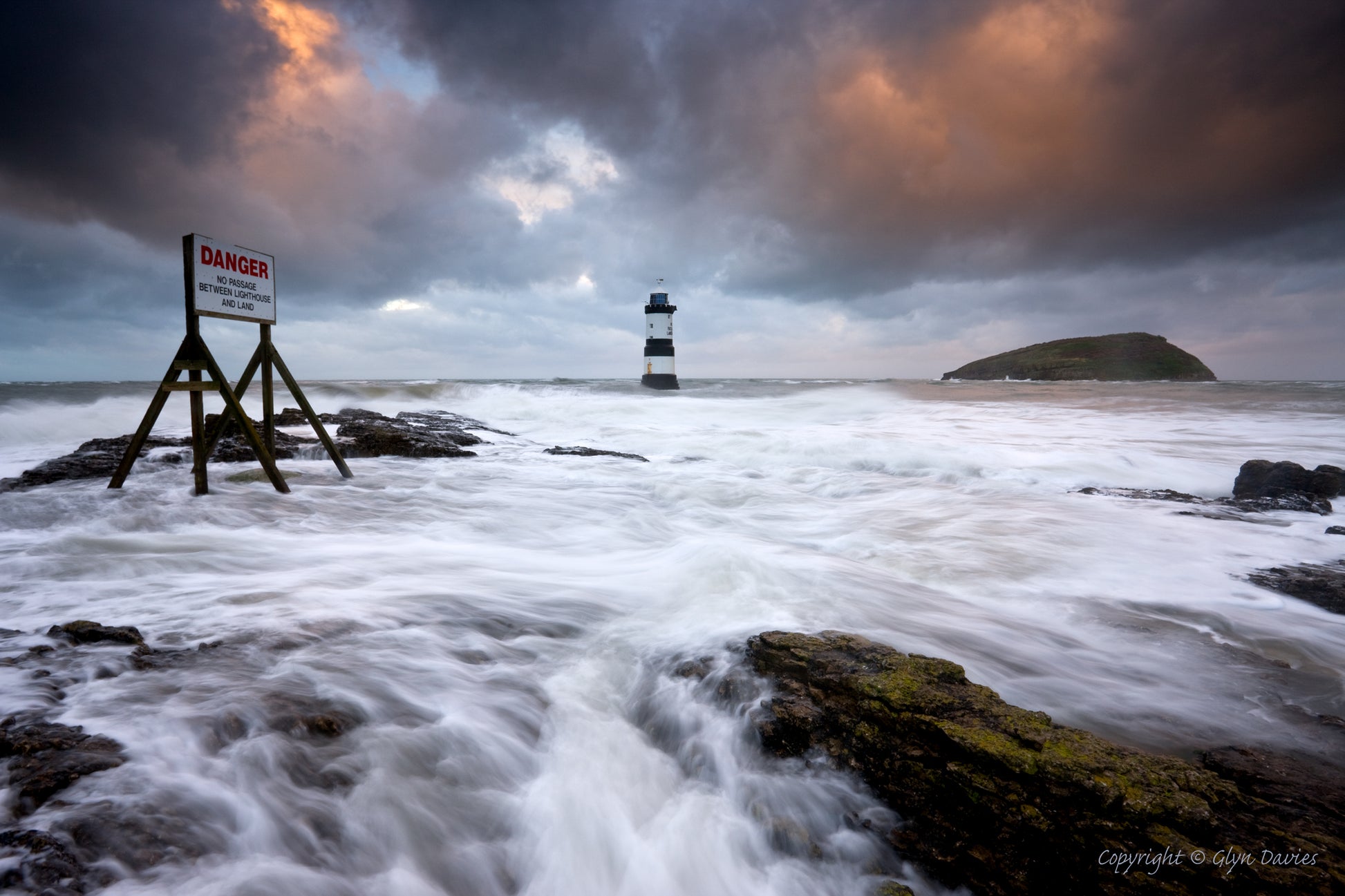 Penmon Point has become less and less appealing to me for photography, but occasionally I still shoot the occasional image there if narrative presents itself. On this cold winter's evening, waves were cascading down and across the limestone reef. As the tide rose, the dark rocks became brighter and whiter owing to the sheer mass of waves and water. Just before the scene became darker and monochromatic, the last remnants of sunlight caught the tops of the clouds, warming them temporarily and splashing them in salmon and pink washes for the briefest of moments, echoing another colourful warning, in red, on the sign fixed to the reef. Night, and a more intense cold forced a retreat to the warmth of the car.