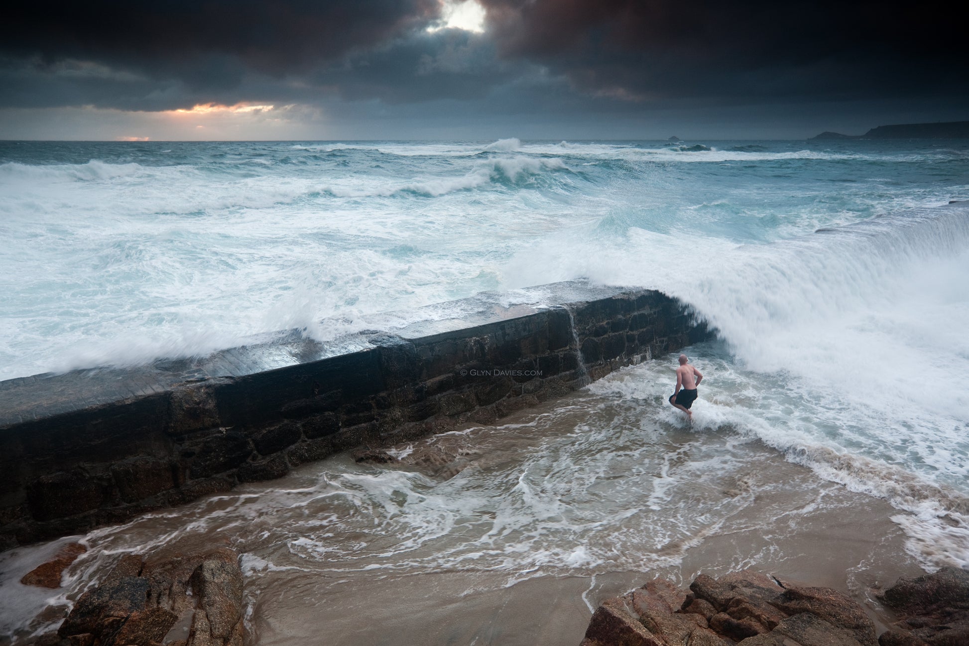 Even in the height of the summer, the weather and light in Cornwall can be dramatic and changeable. Huge seas battered the coast and pounded over the small quay wall at Sennen Cove. In some ways understandably, another visitor cheesed off with the lack of summer weather decided to enjoy the bracing Cornish waters anyway, much to the amusement if slight disbelief of the crowds of onlookers :-)