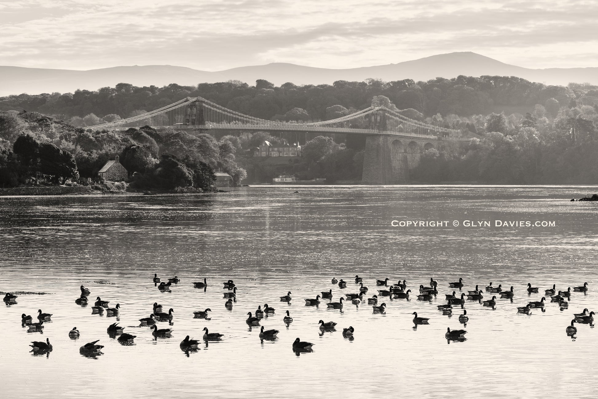 "Early morning, mirror calm water on the Menai Strait, a flock of geese slowly floated by, seemingly enjoying the movement and gentle sunshine. The mist-softened peaks of the Carneddau Mountains of Eryri, Snowdonia, can be seen rising behind the shadowy woodland on the Bangor side of the Menai Suspension Bridge. There was something particularly timeless about this scene, and I imagined generations of these birds doing the same thing long before the magnificent Telford suspension bridge was ever built"