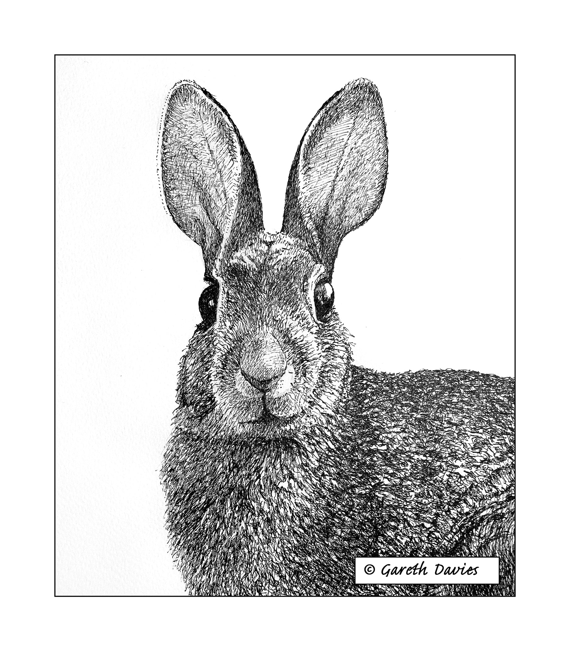 Hare ~ Sgwarnog (No1) is a signed, archival print reproduction of an original pen & ink drawing by Welsh artist, my Dad, Gareth Davies
