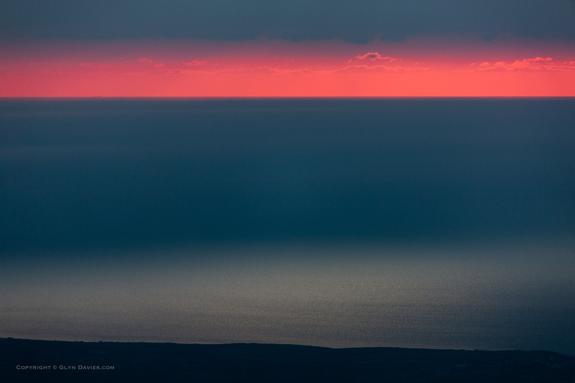 Deep sunset though stormy weather cloud conditions over the Irish Sea, seen from the slopes of Mynydd Mawr mountain in Snowdonia