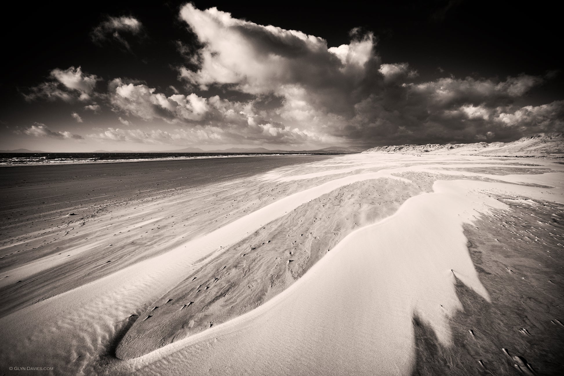 Patterns caused by wind blowing different weight sands across the vast wind swept beach of Morfa Dyffryn near Barmouth, Mid Wales.
