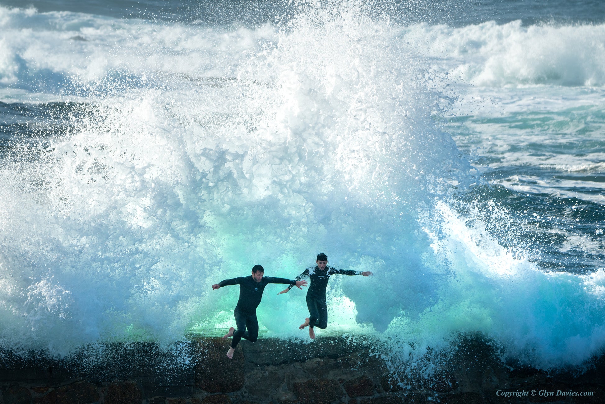 As the Atlantic Ocean pounded against the tiny quay at Sennen Cove, a handful of daring individuals jumped off the quay as the huge waves crashed above them