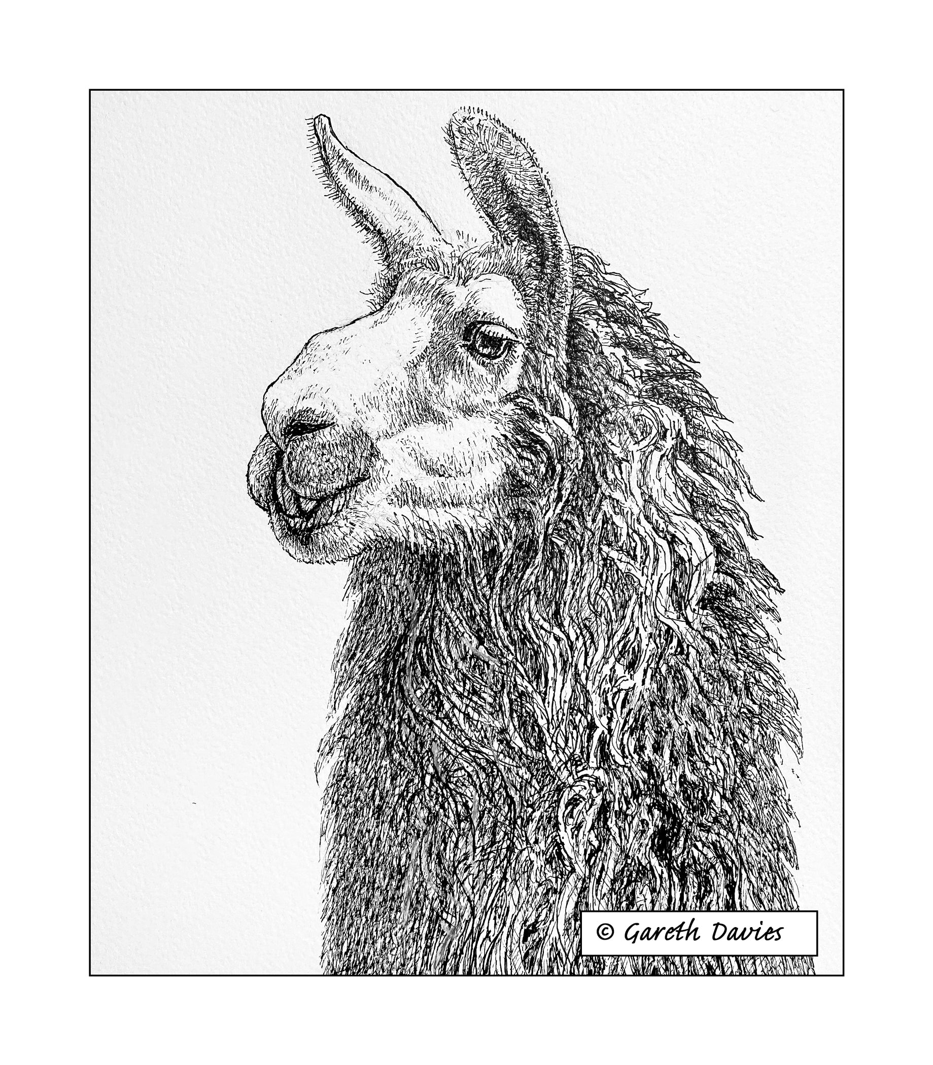 Llama ~ Lama (No1) is a signed, archival print reproduction of an original pen & ink drawing by Welsh artist, my Dad, Gareth Davies