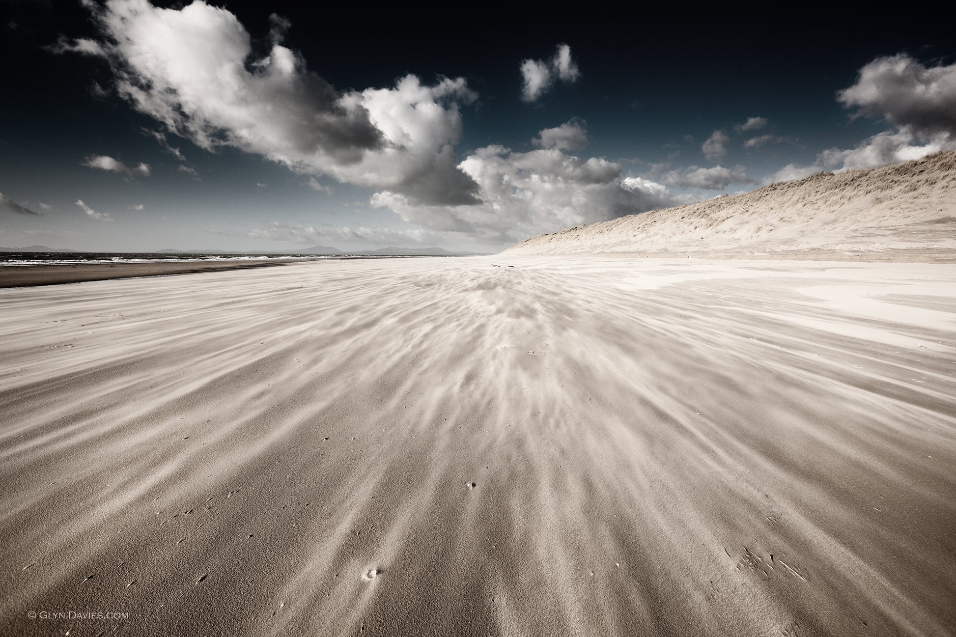 Patterns caused by wind blowing different weight sands across the vast windswept beach of Morfa Dyffryn near Barmouth, Mid Wales.