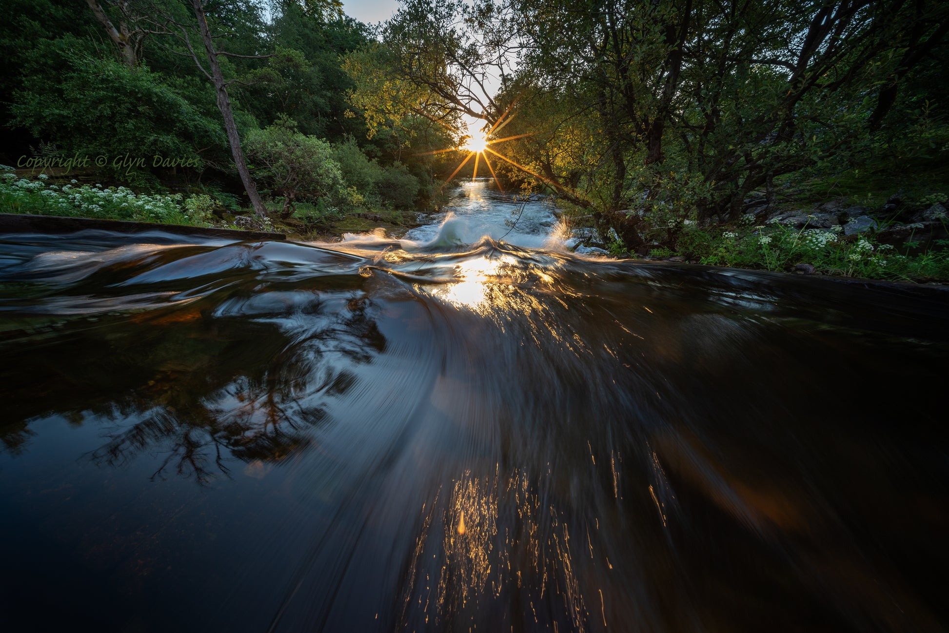 "I stood thigh-deep in the clear, peaty-coloured river, the sharp sting of midges biting any inch of exposed skin. I could feel the smooth, forceful caress of tons of moving water that ploughed westward towards the sunburst sunset. There was a coolness in the air but the flickering pulses of sunlight offered delightful, momentary waves of warmth in this shadowy, watery woodland on the fringes of Eryri (Snowdonia)"