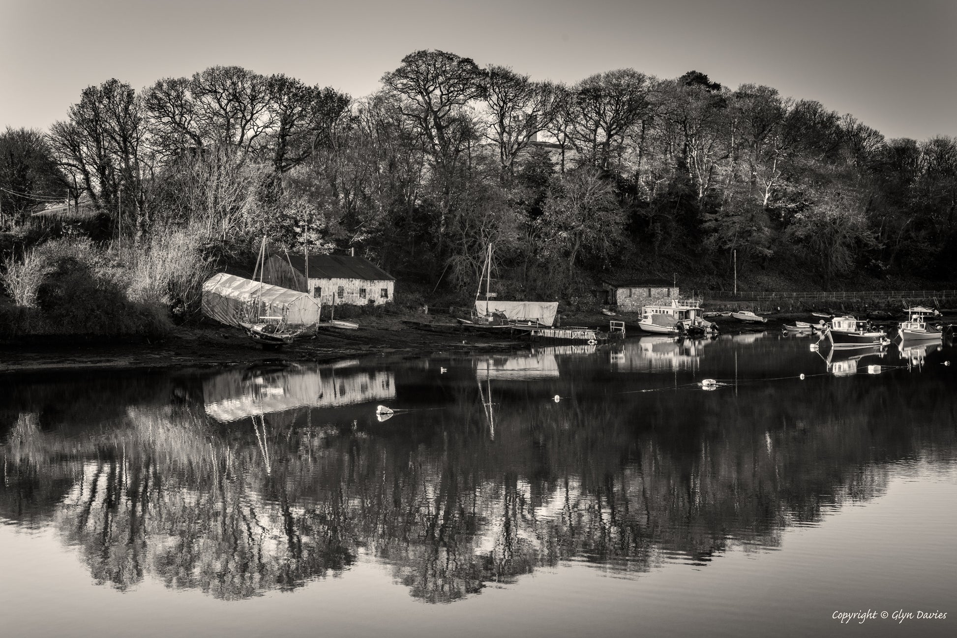 The old boatyard, backed by towering deciduous trees, nestles on the banks of the Afon Seiont River below the grassy hill of Coed Helen. This is part of a a quiet riverside harbour nowadays, which in times past would have been busting with trading ships for the castle & town, and more recently with cargo sailing vessels transporting slate from the vast quarrying industry in nearby Eryri. Today, the busy periods of the past are just ghosts, beautifully reflected in the mirror-flat waters of the slowly flowing Seiont.