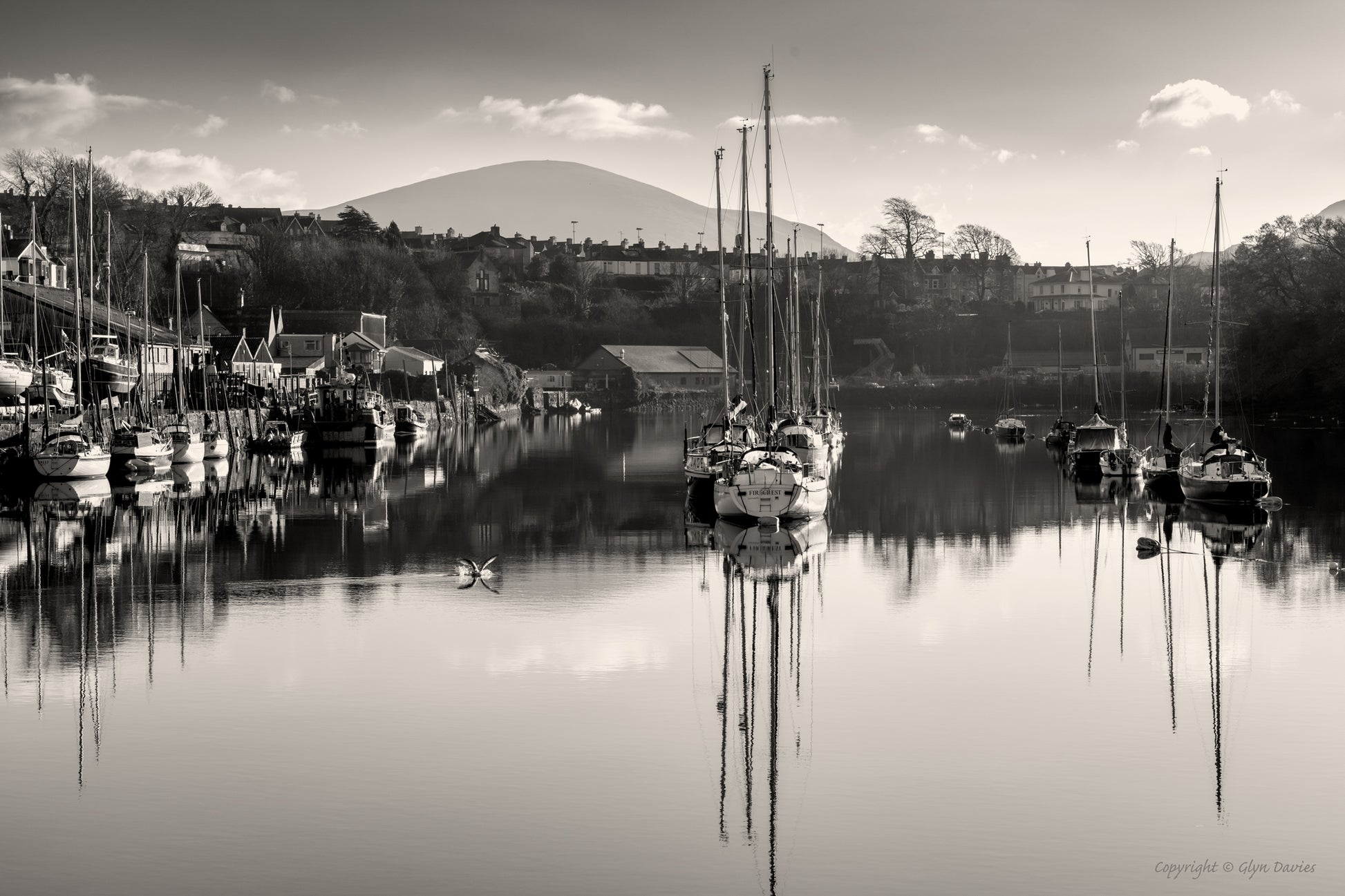 A few remaining yachts sit motionless on the Afon Seiont River in Caernarfon on a sunny but cold winter morning. The town was silent and little was moving on the water, which held mirror-calm reflections - until out of nowhere, a Herring Gull seemed to crash-land nose first, shattering the serenity of the place, yet equally making me smile.