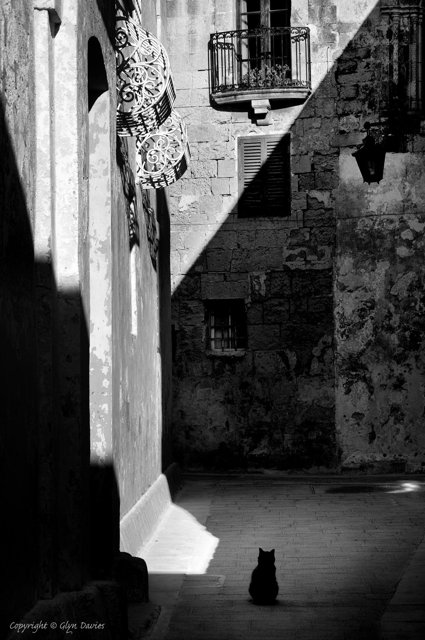 A black cat sits quietly in a shadowy street in the Medieval walled city of Mdina in Malta. The heat and crowds were oppressive at this fascinating but popular tourist destination, so just me, and the cat, were taking time out to enjoy some, cool, peace and quiet.