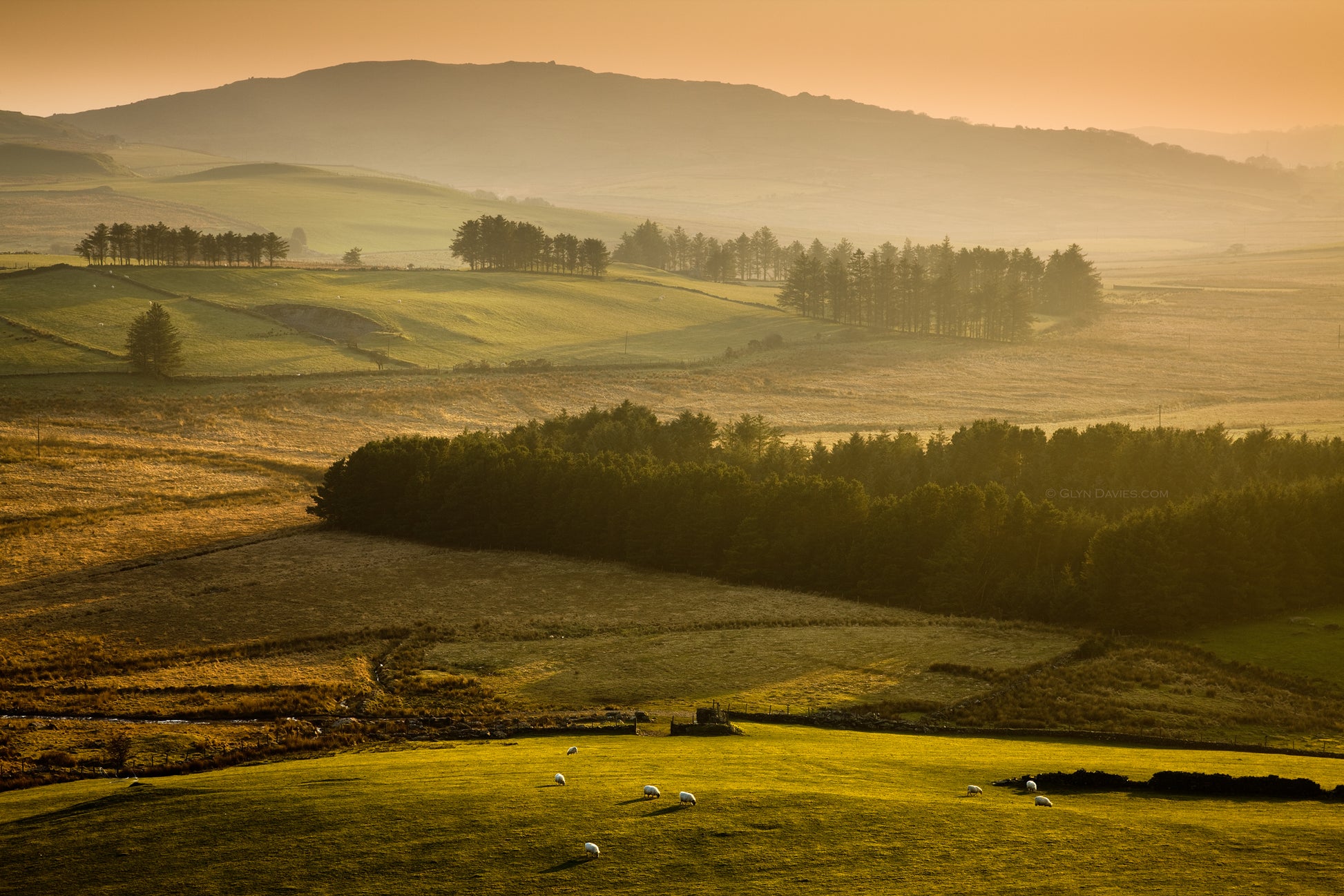 "Featureless mountain-tops led down to isolated 'findings' before shrubs, trees and man-made forms started dominating the landscape once more. A mist had built in the late afternoon and was backlit by warm evening sunshine. The rows of tall trees arranged across the rolling hillsides made the landscape look more Tuscan than Welsh"