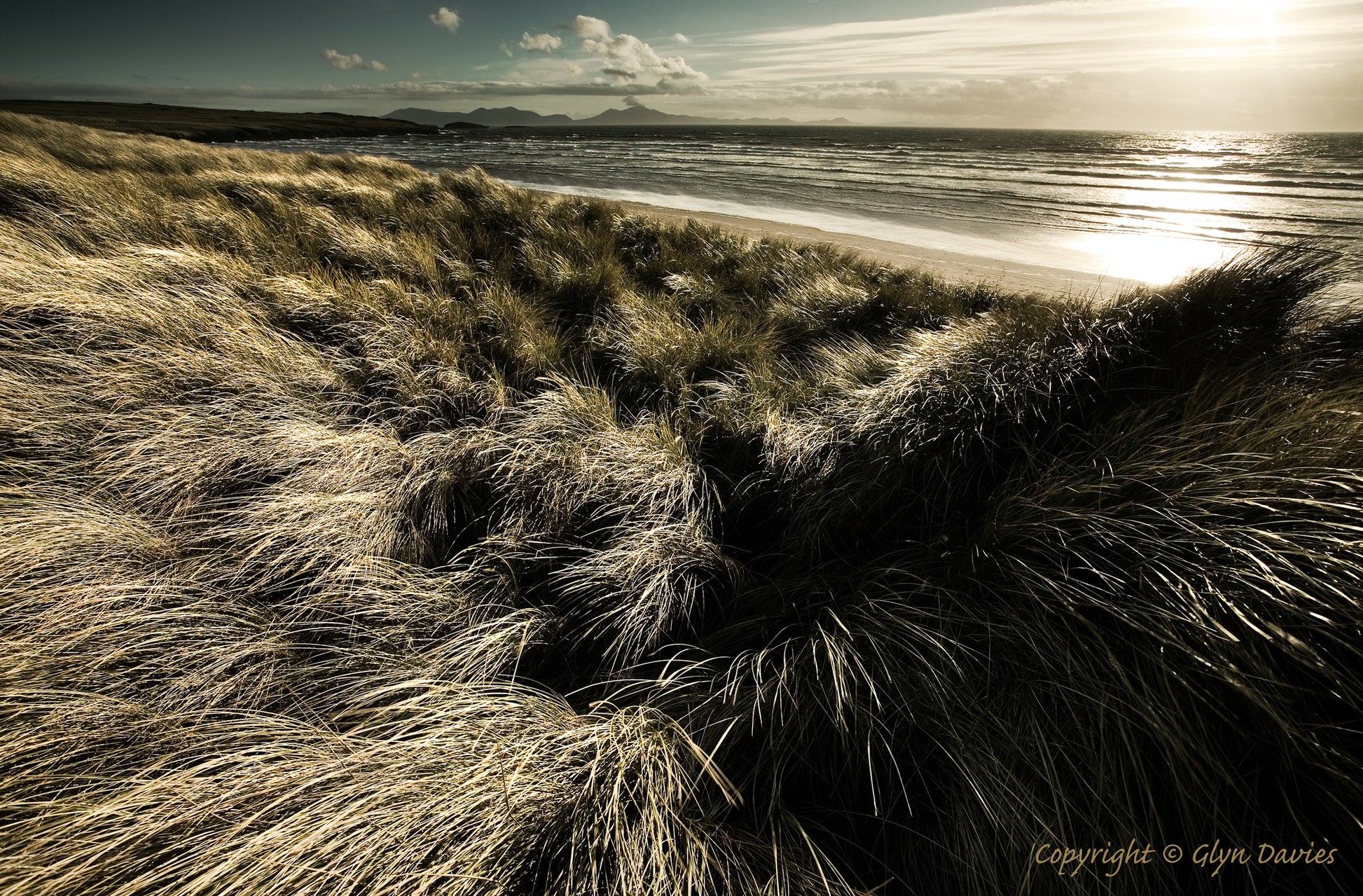 "Strong wind blows the Marram grass on large sand dunes at Aberffraw, West Anglesey. The huge and private Bodorgan Estate can be seen to the left, and the mountains of Eryri and the Llyn Peninsula can be seen in the distance. White horses race to the shoreline and the gale whips up sea spray from the breaking manes”