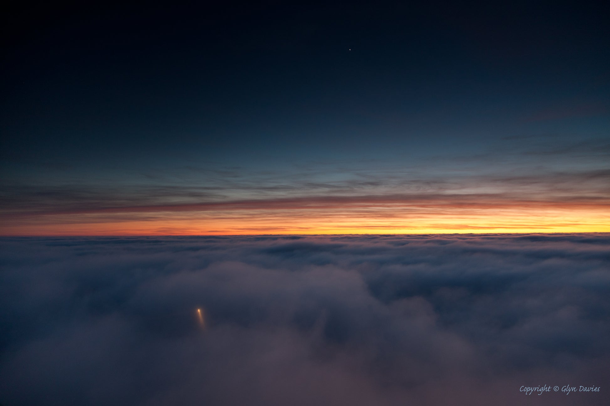 "Rays of light from South Stack lighthouse, Holy Island, Anglesey, under a thick bank of fog at sunset, caused by a second day of temperature inversion over North Wales and here over the Irish Sea. Fishermen's torches light the rocks at the base of the cliffs in the blue gloom"