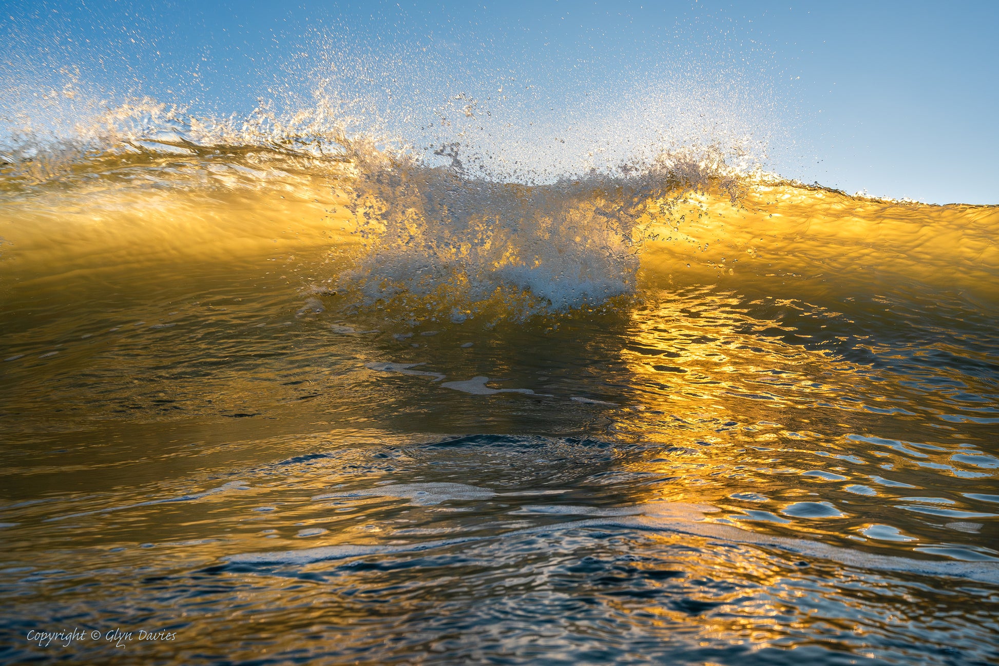 The glorious evening sunshine backlit the swell, and with the brown sediment suspension in the water, the waves look almost golden.