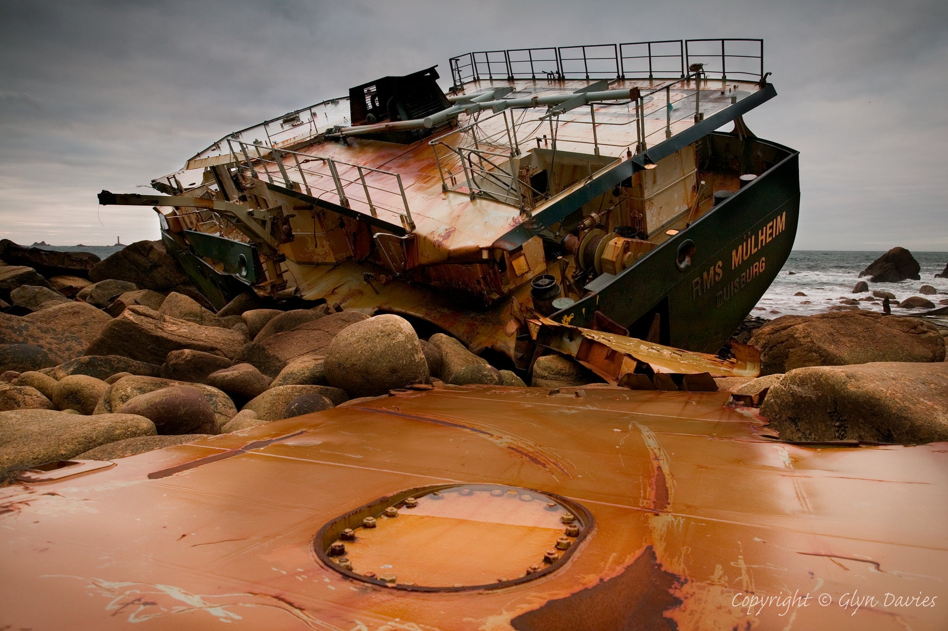 "My first visit to this modern day shipwreck. I was delighted that I could get so close to this wreck and being alongside amongst giant granite boulders strewn with twisted metal and hull plates made me very aware of how powerful the sea really is. There was the constant creaking of metal from the sea adge as waves lifted and dropped sections of twisted metal as large as four men head to toe. It was actually a little eerie in this zawn of a dead ship surrounded by towering granite cliffs of Land's End"
